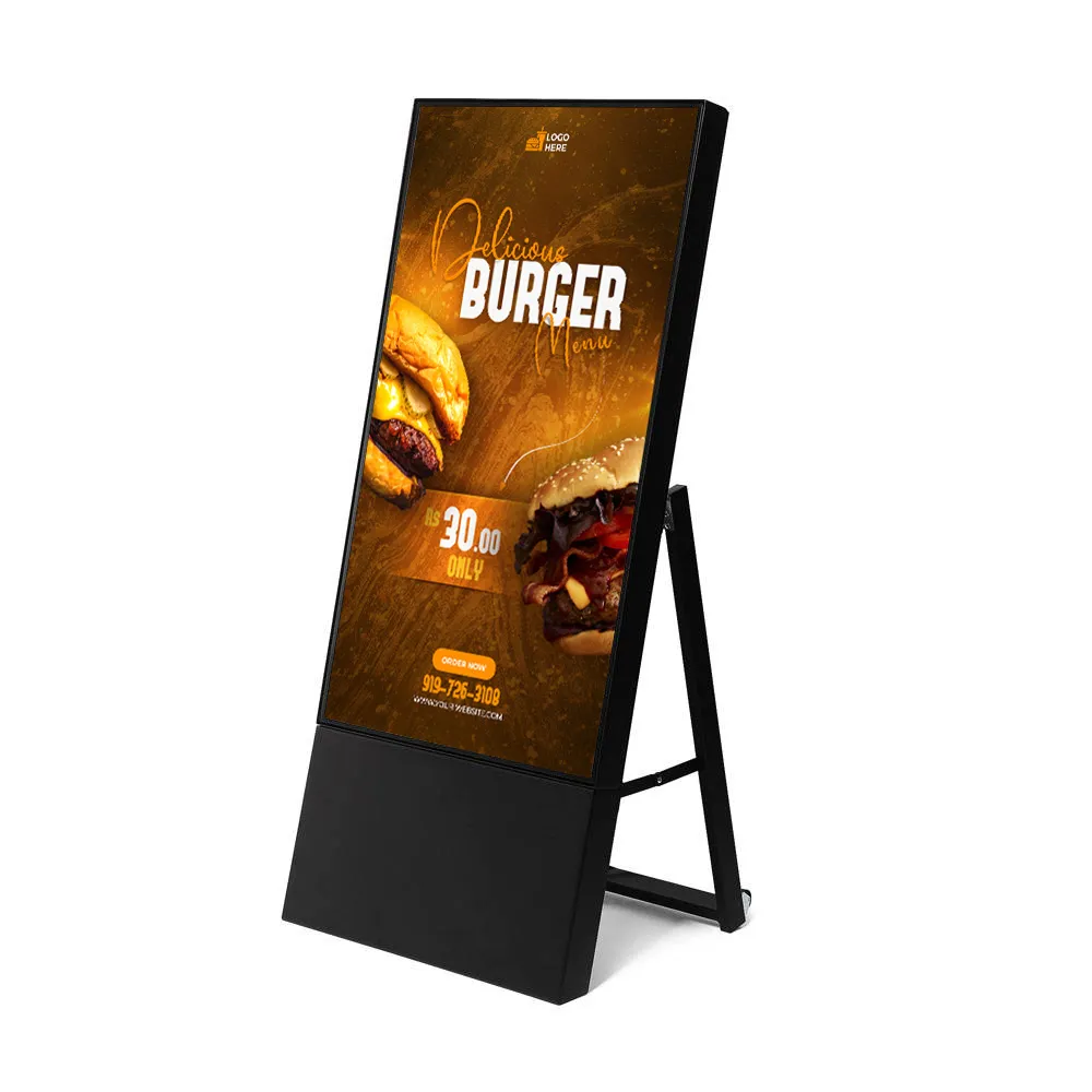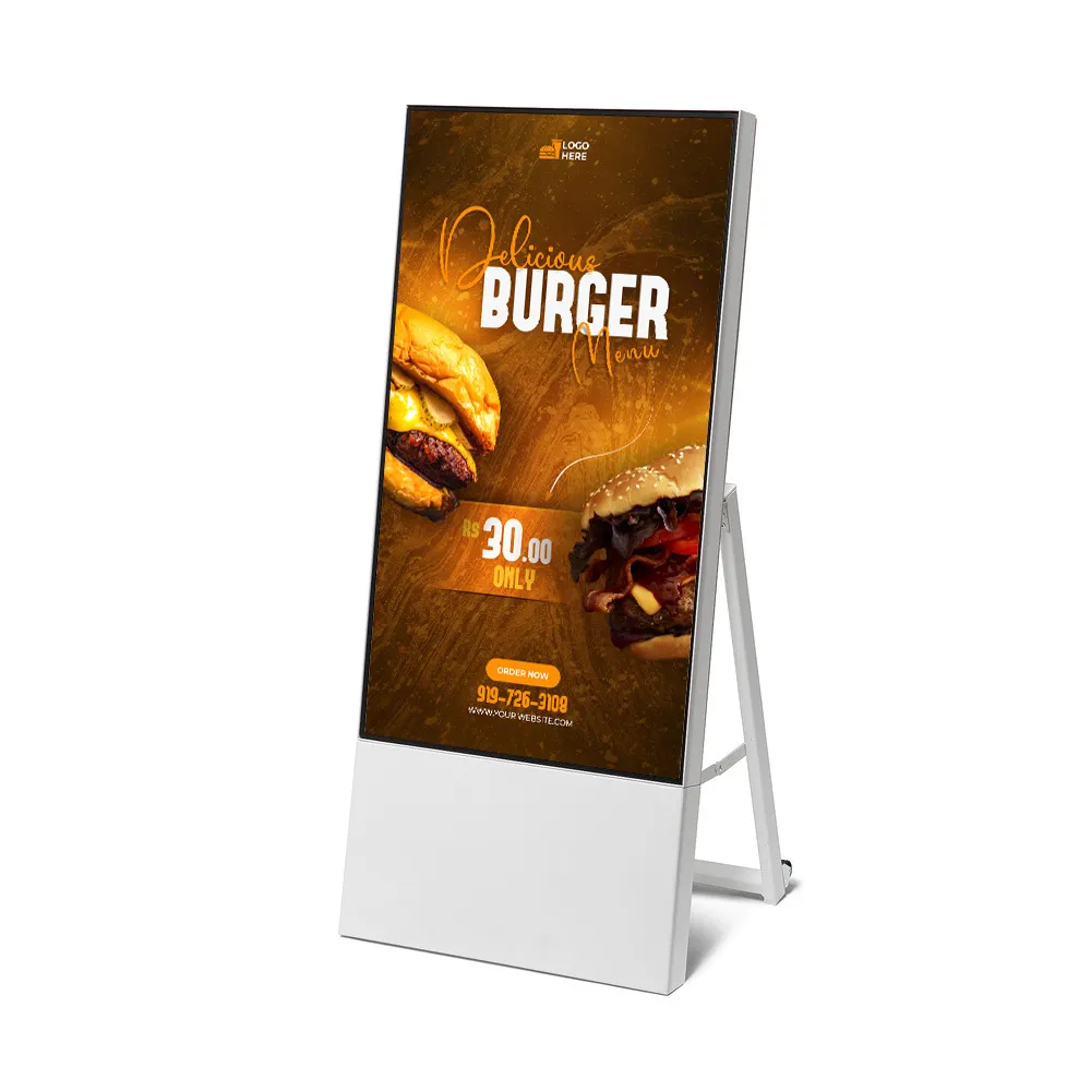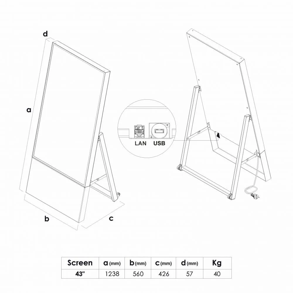 Digitálne áčko s obrazovkou 43" v elegantnom, štíhlom dizajne. Skladacia kovová konštrukcia s kolieskami, vysoká viditeľnosť obsahu a prevedenie v bielej alebo čiernej farbe pre interiérové prezentácie.
