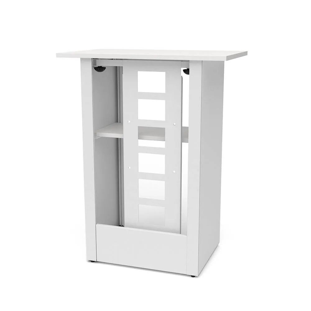 Stolík je možné konfigurovať pre orientáciu na výšku alebo na šírku podľa priestoru a typu prezentácie. Vnútorná polica umožní uložiť materiály a príslušenstvo tak, aby zostala pozornosť zameraná na samotnú prezentáciu.