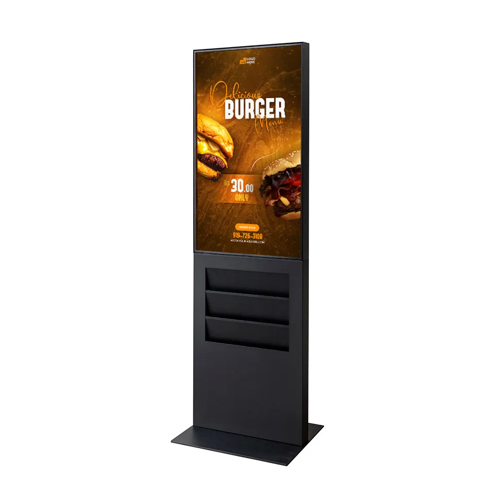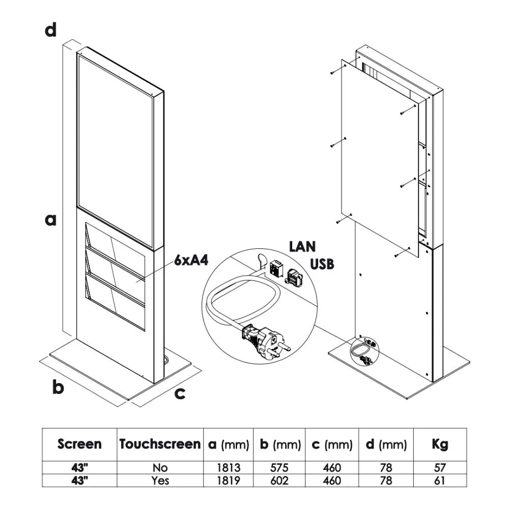Jednostranný digitálny totem pre interiérové použitie s integrovaným zásobníkom 6x A4. Stojanová kovová konštrukcia, profesionálny displej je súčasťou riešenia. Dotyková obrazovka je dostupná ako voliteľná verzia.