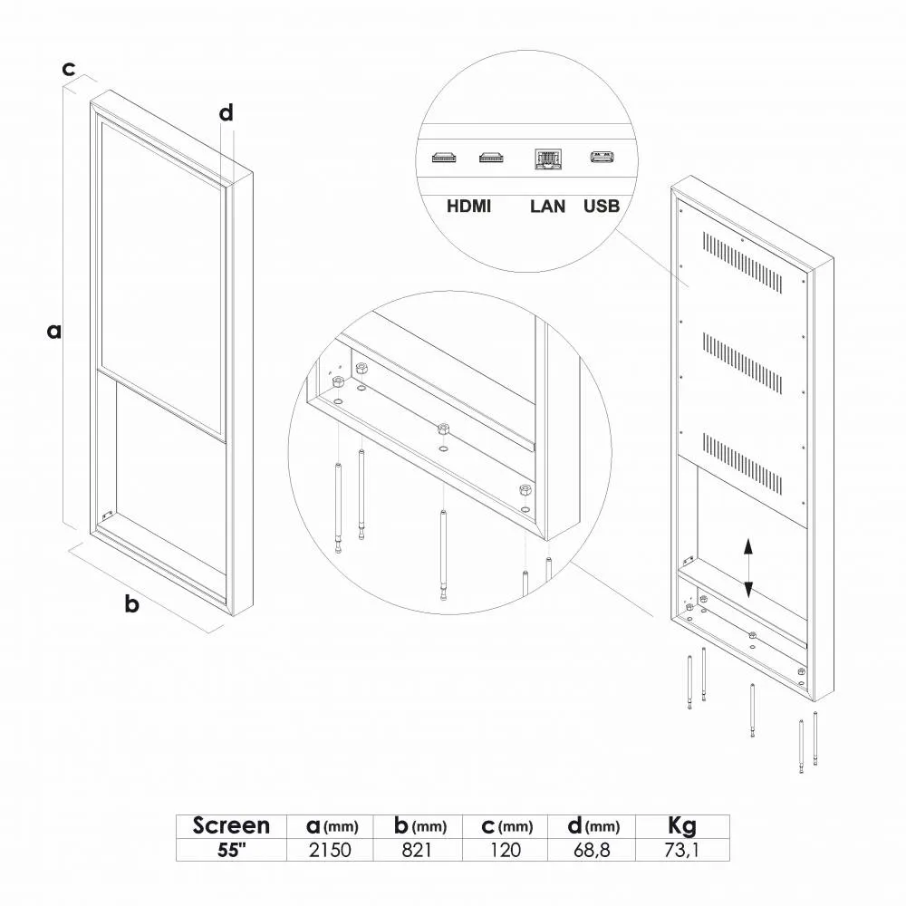 Obsah možno aktualizovať pomocou plug & play cez USB alebo vzdialene cez Wi-Fi či LAN. Robustná konštrukcia kombinuje vysokú odolnosť s moderným dizajnom.
