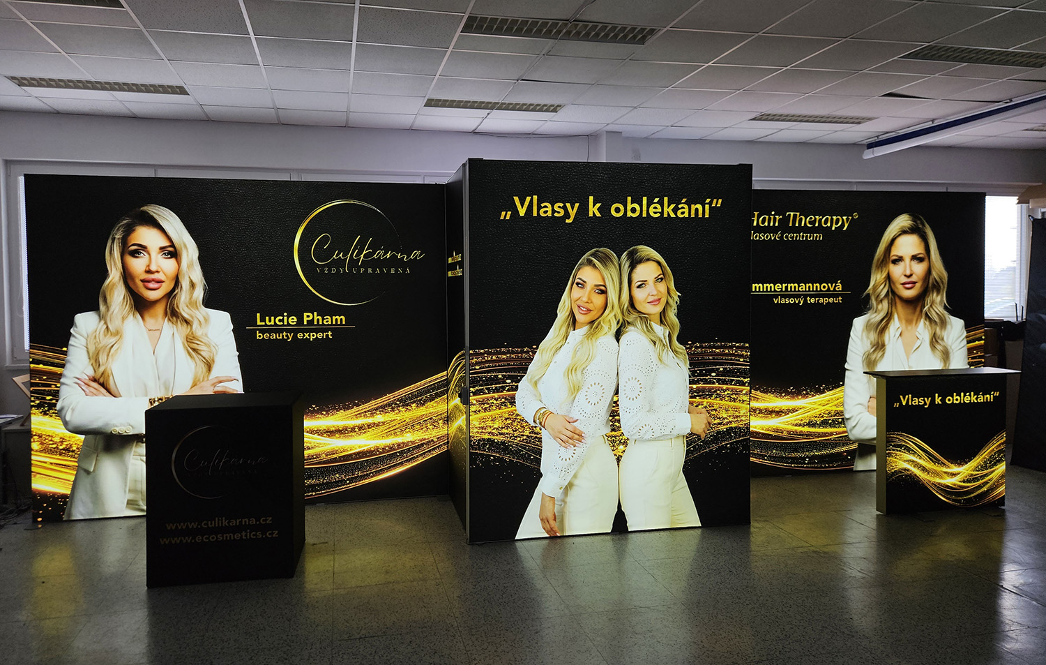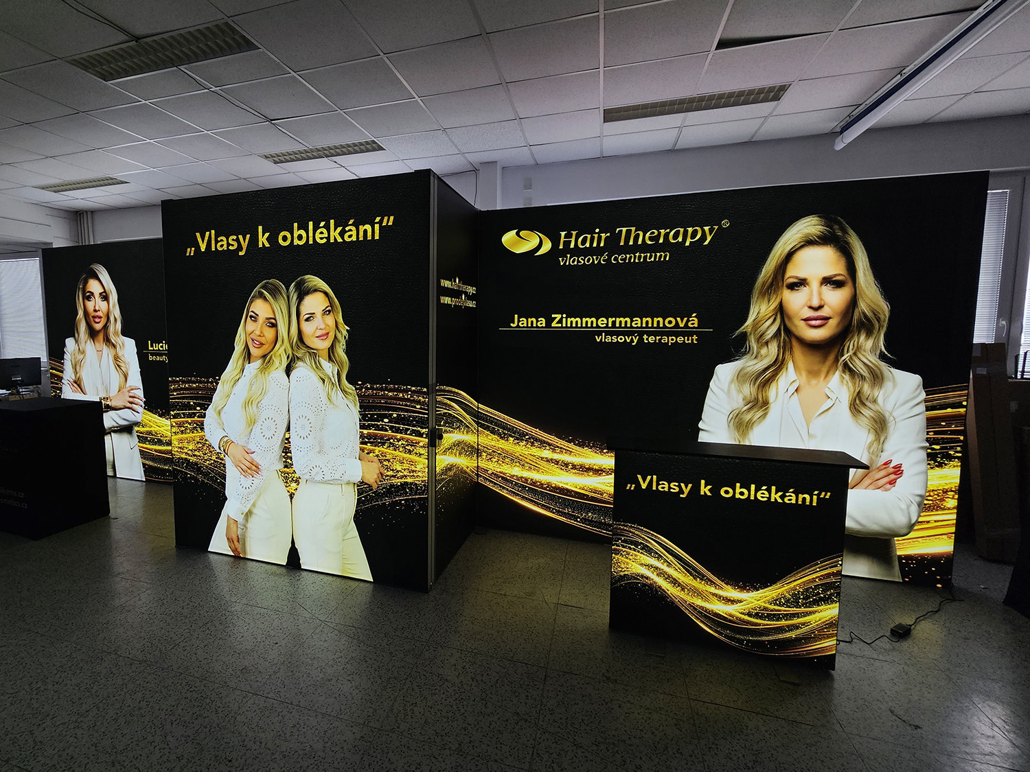 Od jednoduchej LED prezentácie sa tak dá prejsť ku komplexnejšej expozícii so svetelným zázemím, rohovým napojením aj ďalšími nadväzujúcimi prvkami – a to pri zachovaní jednotného vzhľadu celého stánku.